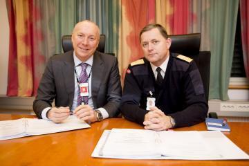 YTEEVNE. – Det er veldig kort avstand mellom det som skal leveres på denne avtalen og den operative yteevnen Forsvaret kommer til å ha de nærmeste årene, sier flaggkommandør Nils Helle. Til venstre Kjell Rusti, administrerende direktør for Sopra Steria i Skandinavia. Foto: Hanne Kristine Fjellheim