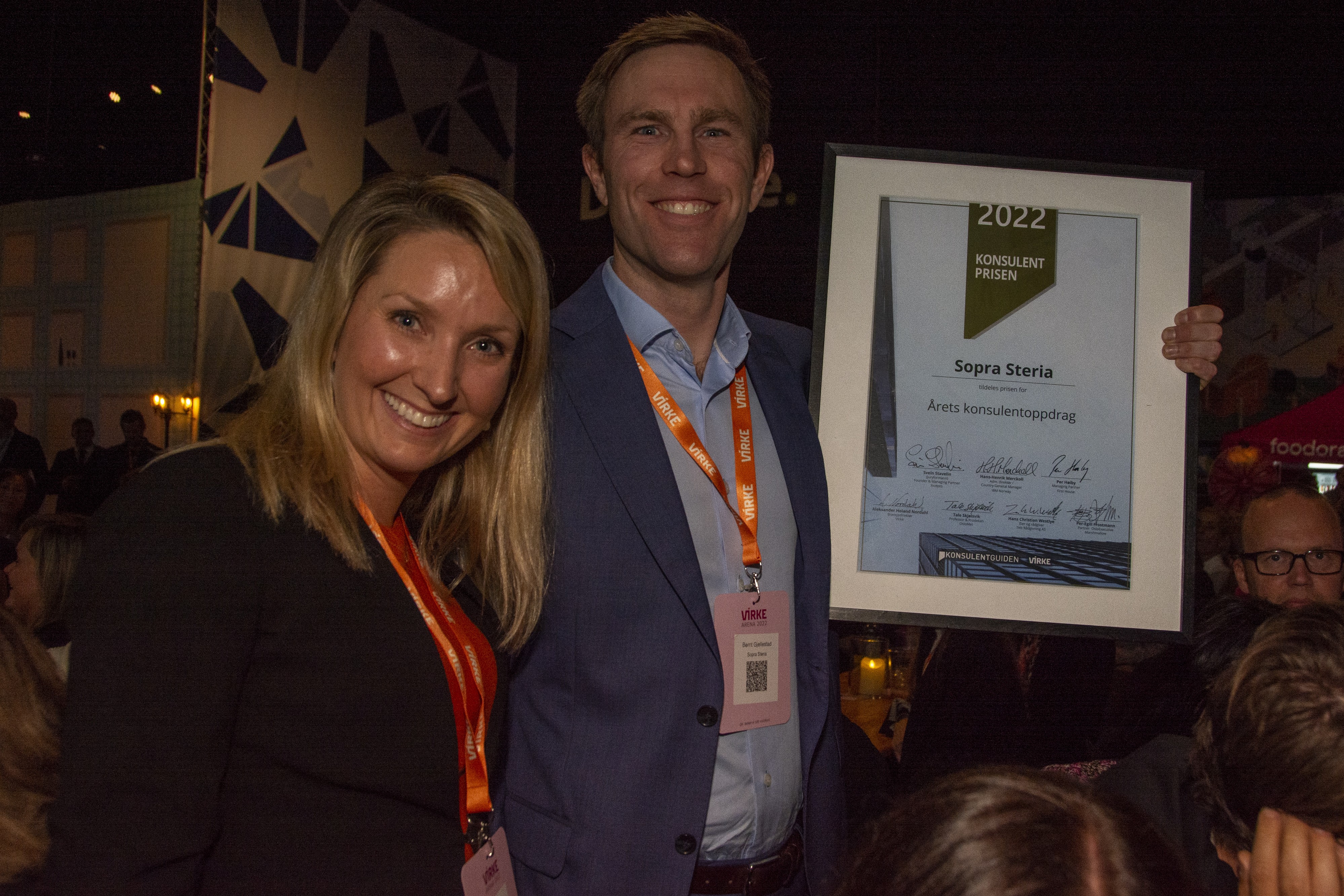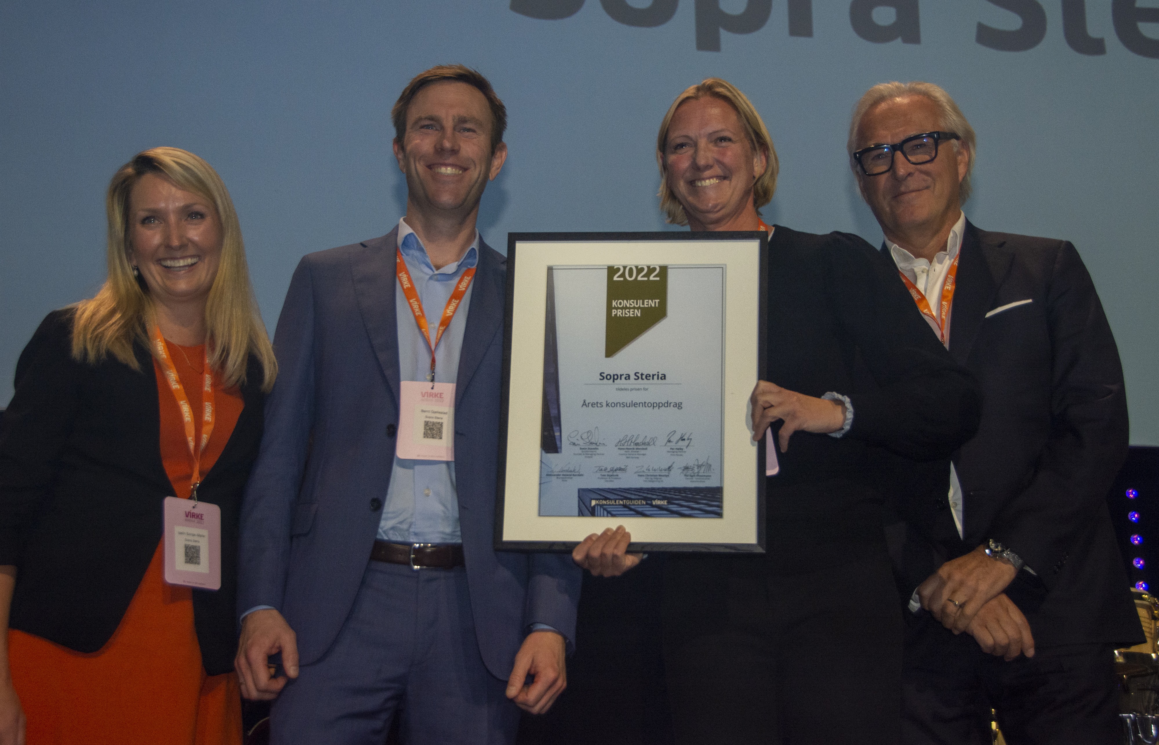 TIL TOPPS. Stor jubel og solid heder i Oslo Spektrum torsdag kveld, da prosjektleder Bernt Gillestad og leder for risiko og styring, Iselin Songe-Møller i Sopra Steria fikk prisen for «Årets konsulentoppdrag» i Virke Arena torsdag kveld. Til høyre, fra juryen: Prodekan Tale Skjølsvik fra OsloMet og juryformann Svein Stavelin. Foto: Kjetil Grude Flekkøy, Sopra Steria