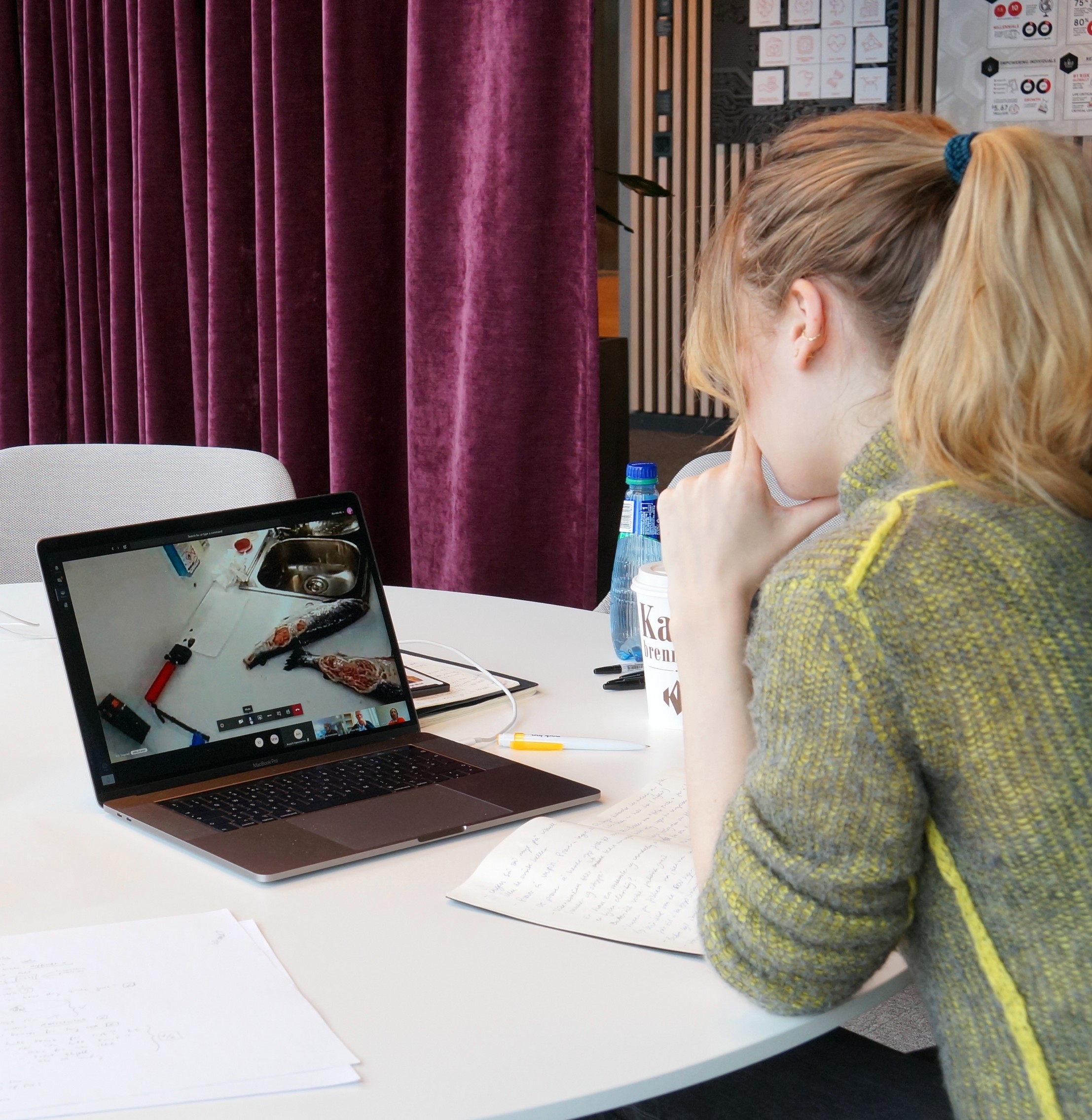 Inne på land sitter en veterinær og ser de samme bildene av laksen. Via sin egen PC deltar hun på undersøkelsen. Fiskeoppdretteren får nøye instruks om hvordan han bør gå fram for å ta en prøve fra fisken. Takket være HoloLens-brillene er han veterinærens armer og øyne.